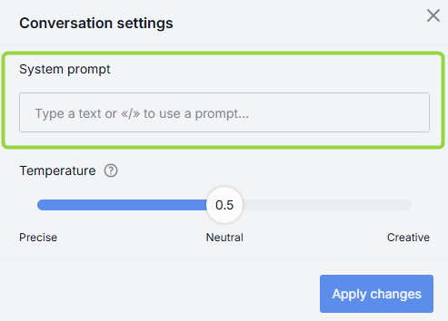 Type / in the text box to select any previously created prompt as a system prompt (for details, refer to the Create in Prompts), and it will set the context and tone for the whole conversation.