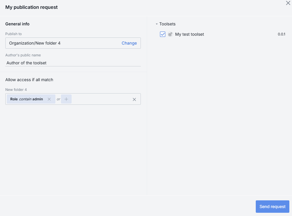 - An admin receives the publication request, reviews it and either approves or declines. Refer to Process Publish Requests to learn more. Note, that admin can also modify the publication request, including access rules.